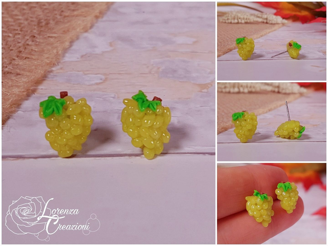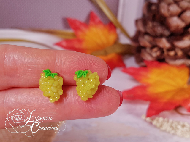 Orecchini a lobo artigianali, uva bianca, modellati e dipinti a mano in argilla polimerica