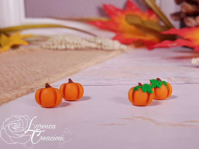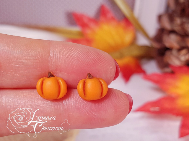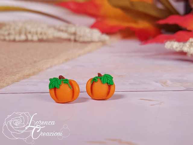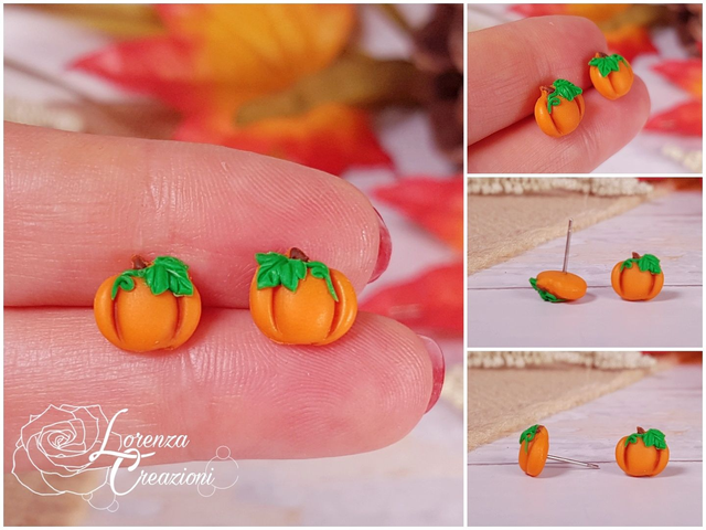 Orecchini a lobo con zucca modellata e dipinta a mano in argilla polimerica (fimo) e colori acrilici.