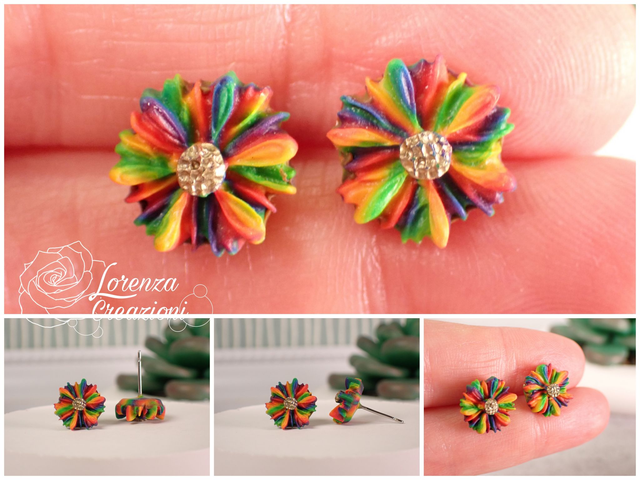 Orecchini artigianali modellati a mano in argilla polimerica (fimo). Floreali con fiore dai colori arcobaleno e vivaci.
