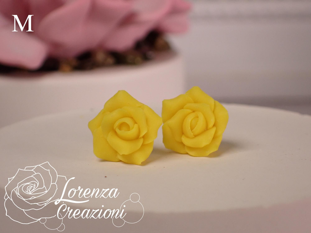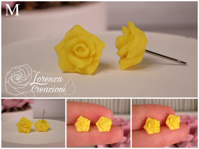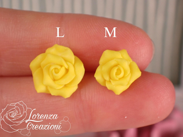 Ogni rosellina è modellata a mano e composta da 10 petali di argilla polimerica (fimo). Montate con minuteria in acciaio 316L, ipoallergenico e inossidabile.