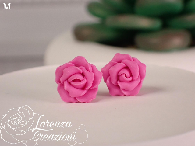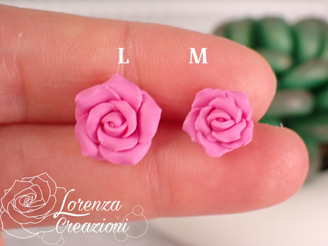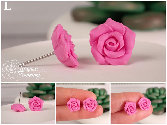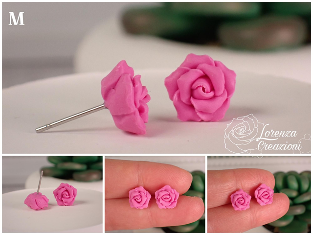 Ogni rosellina è modellata a mano e composta da 10 petali di argilla polimerica (fimo). Montate con minuteria in acciaio 316L, ipoallergenico e inossidabile.