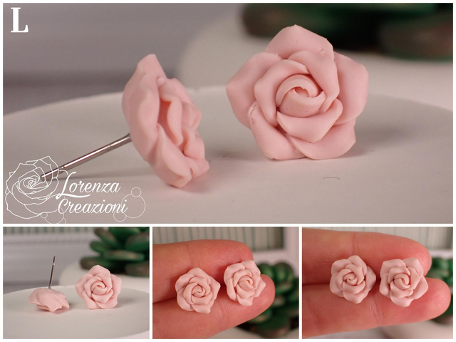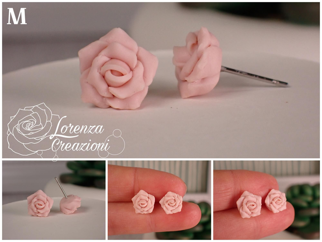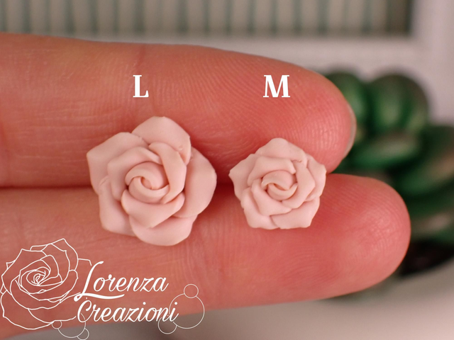 Ogni rosellina è modellata a mano e composta da 10 petali di argilla polimerica (fimo). Montate con minuteria in acciaio 316L, ipoallergenico e inossidabile.