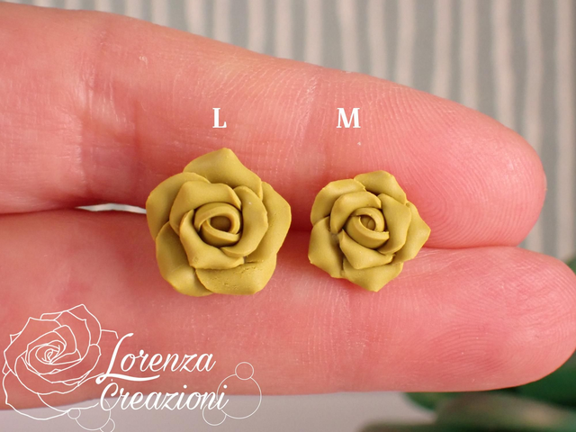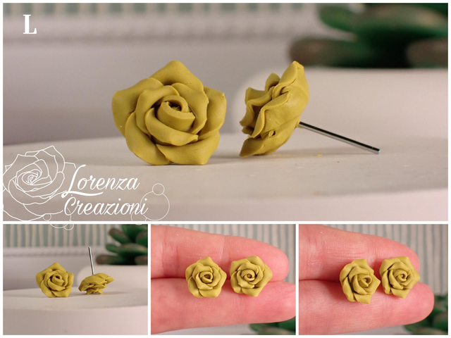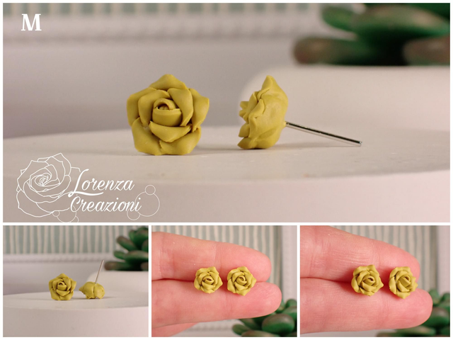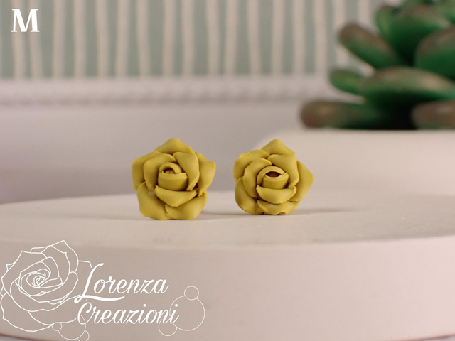 Ogni rosellina è modellata a mano e composta da 10 petali di argilla polimerica (fimo). Montate con minuteria in acciaio 316L, ipoallergenico e inossidabile.