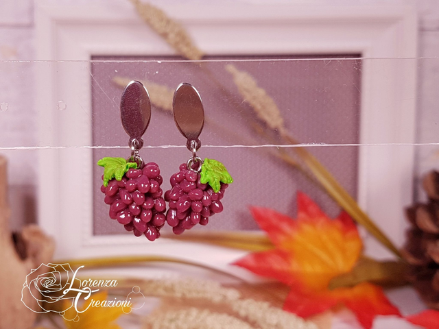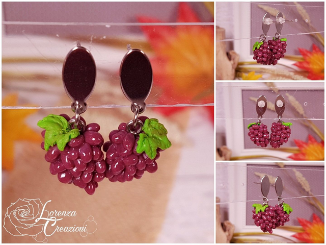 Orecchini pendenti artigianali, uva nera, modellati e dipinti a mano in argilla polimerica