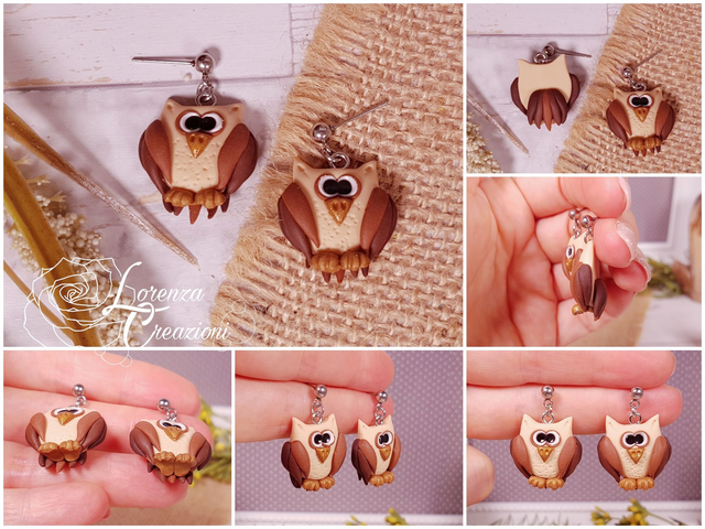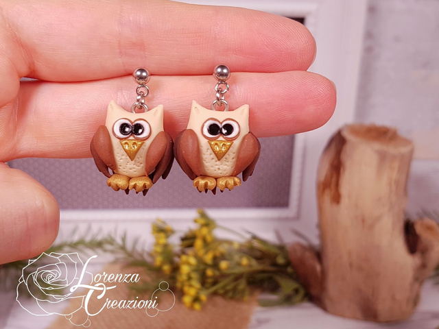 Orecchini pendenti artigianali modellati a mano in argilla polimerica (fimo) a forma di gufo.
