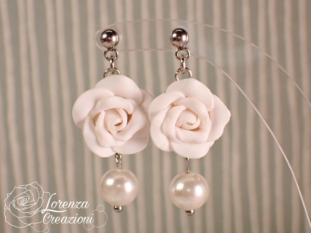 Orecchini pendenti rose bianche con perla