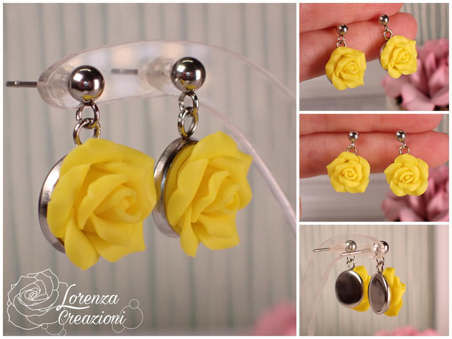 Ogni rosellina è modellata a mano e composta da 10 petali di argilla polimerica (fimo). Montate con minuteria in acciaio 316L, ipoallergenico e inossidabile.