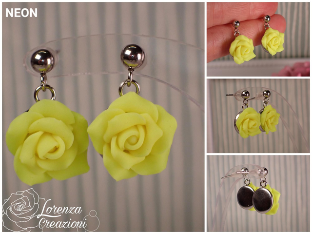 Ogni rosellina è modellata a mano e composta da 10 petali di argilla polimerica (fimo). Montate con minuteria in acciaio 316L, ipoallergenico e inossidabile.