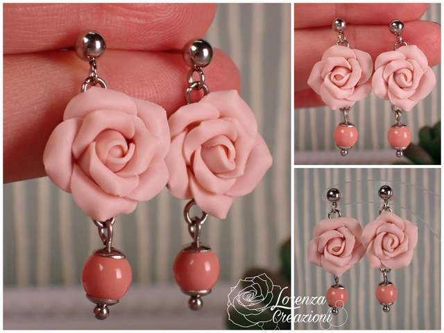Ogni rosellina è modellata a mano e composta da 10 petali di argilla polimerica (fimo). Montate con minuteria in acciaio 316L, ipoallergenico e inossidabile.