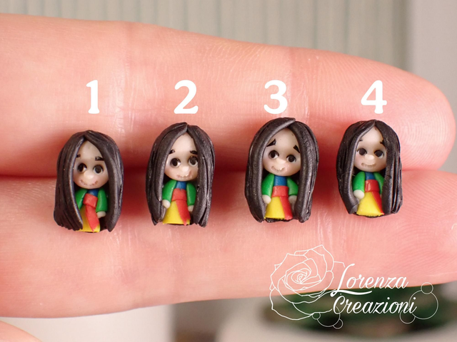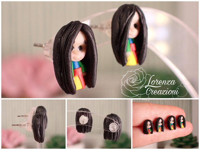 Modellati e dipinti a mano in argilla polimerica (fimo), pigmenti e acrilico. Montati con minuteria in acciaio 316L, ipoallergenico e inossidabile.