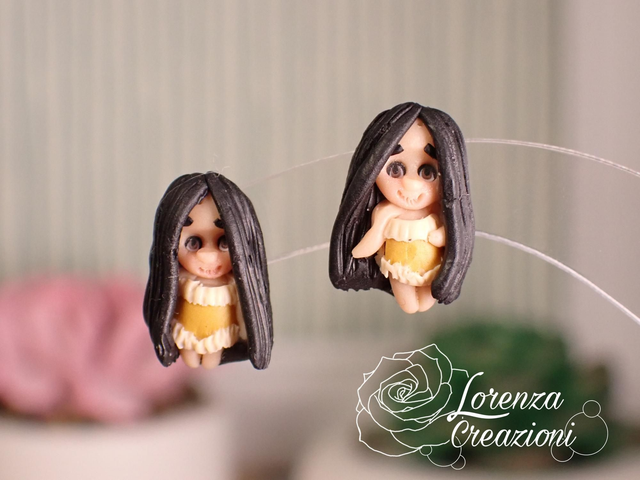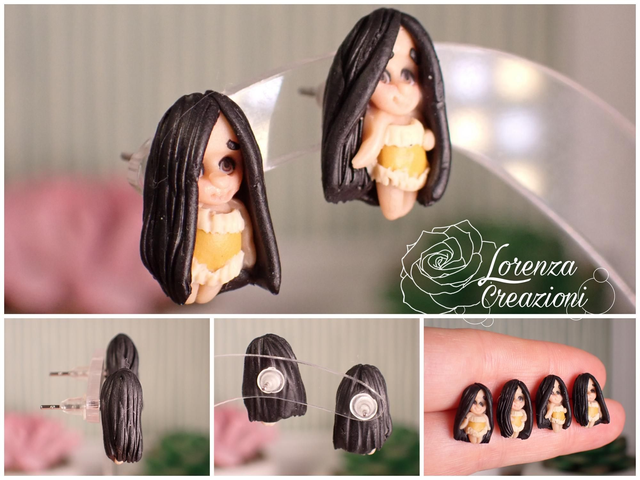 Modellati e dipinti a mano in argilla polimerica (fimo), pigmenti e acrilico. Montati con minuteria in acciaio 316L, ipoallergenico e inossidabile.