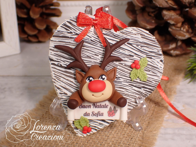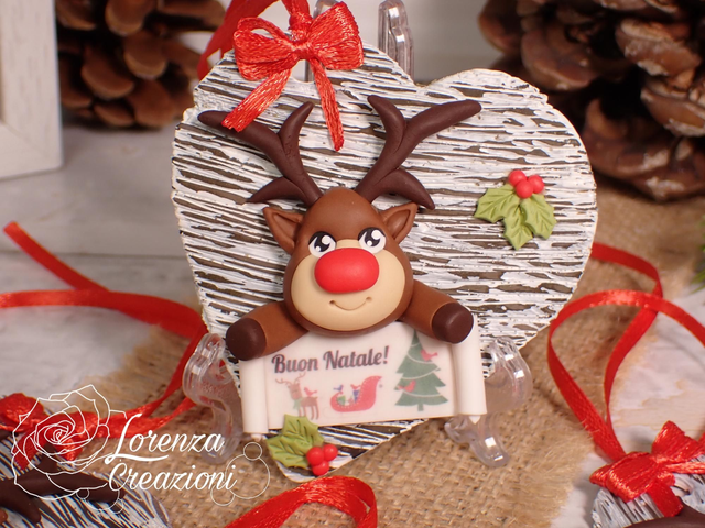 Pronta consegna. Decorazione natalizia con Rudolph dal naso rosso. Modellata e dipinta a mano in fimo.