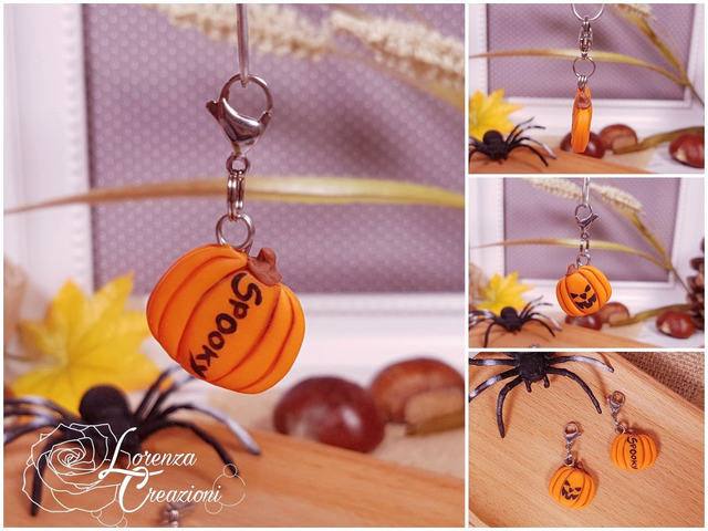 Charm con zucca modellata e dipinta a mano in argilla polimerica (fimo) e colori acrilici.