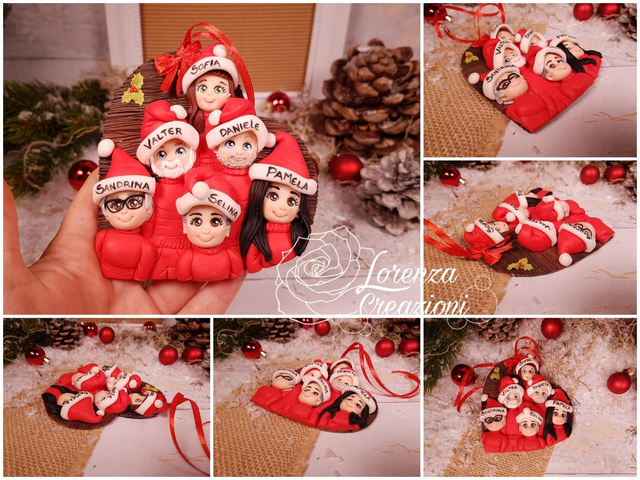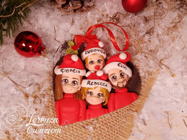 Cuoricino di Natale personalizzato con rappresentazione della famiglia o amici. Nomi e visi personalizzati. Modellato e dipinto a mano in argilla polimerica.