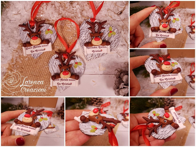 Decorazione natalizia con Rudolph dal naso rosso, personalizzata. Modellata e dipinta a mano in fimo.