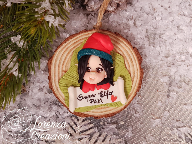 Elfo personalizzato su fetta di legno. Personalizzato, modellato e dipinto a mano in argilla polimerica, fimo.