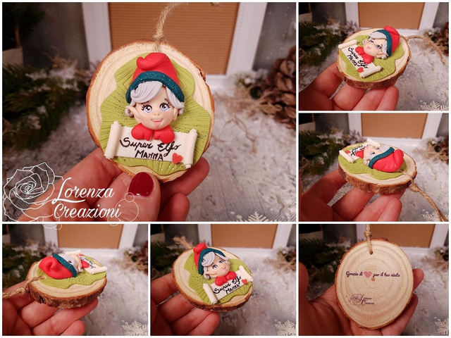 Modellato e dipinto a mano in argilla polimerica (fimo) su una fettina di legno pronta per essere appesa all'albero di Natale.