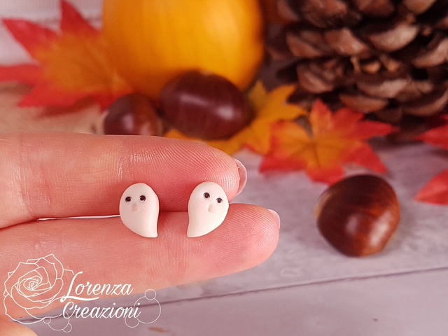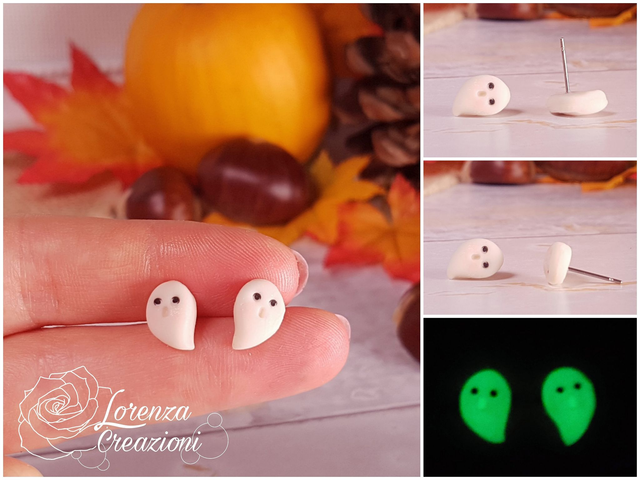 Orecchini a lobo con piccolo fantasmino modellato e dipinto a mano in argilla polimerica (fimo) e colori acrilici. Il fantasma è realizzato con fimo fluorescente quindi si illumina al buio se precedentemente si è caricato con la luce del sole o similare.