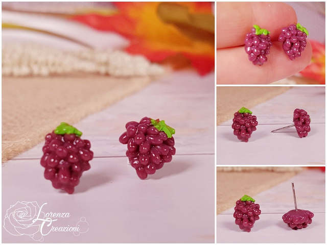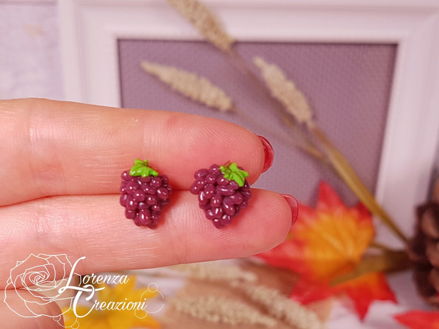 Orecchini a lobo artigianali, uva nera, modellati e dipinti a mano in argilla polimerica