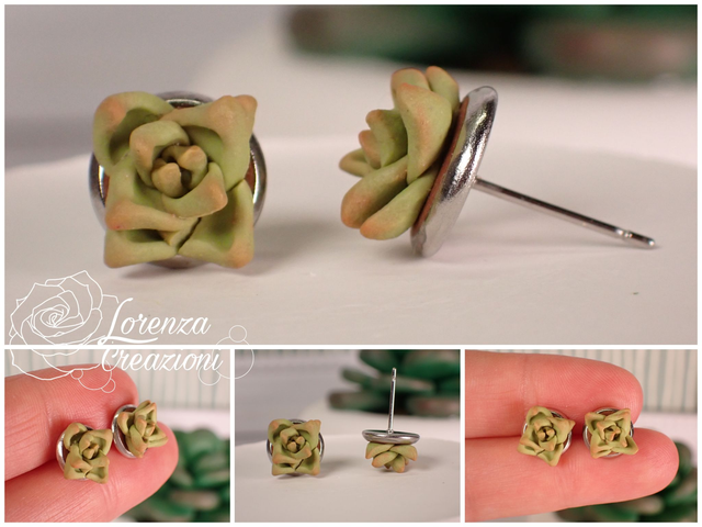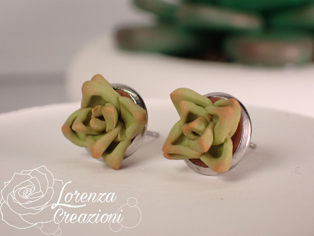 Orecchini artigianali modellati a mano in argilla polimerica (fimo). Floreali con piccola pianta grassa sul verde oliva.