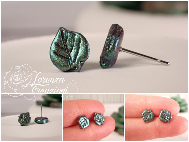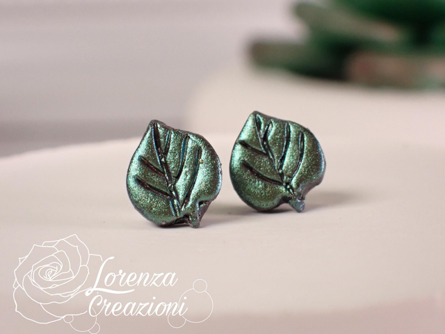 Orecchini artigianali modellati a mano in argilla polimerica (fimo). Floreali a forma di foglia a cuore.