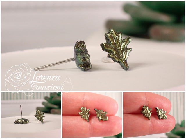 Orecchini artigianali modellati a mano in argilla polimerica (fimo). Floreali a forma di foglia di quercia