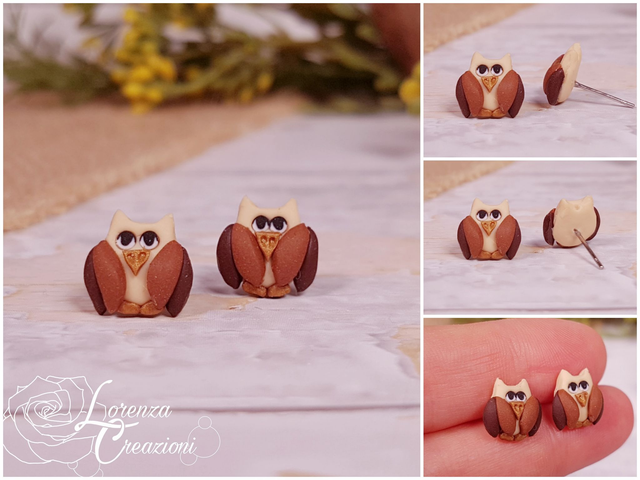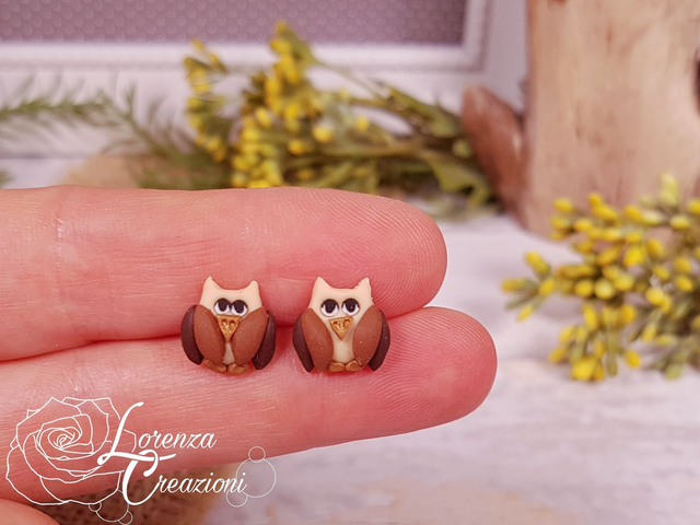 Orecchini artigianali modellati a mano in argilla polimerica (fimo) a forma di gufo.