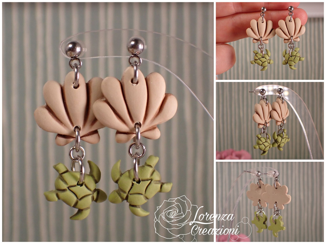 Orecchini a tema marino con tartarughe e conchiglie, verde e beige